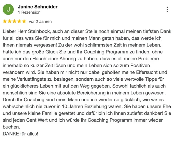 „Ich hätte nie gedacht, dass sich nach nur drei Sitzungen so viel verändert. Sie haben unsere Ehe gerettet.“ – Janine S. (Google Bewertung – weiter unten)